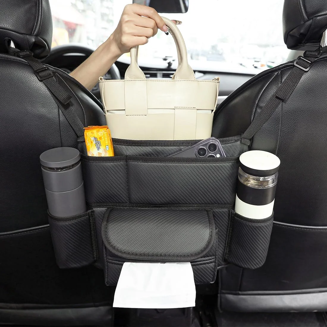5. راحة إضافية: بفضل المحفظة، يمكنك الوصول بسهولة إلى العناصر التي تحتاجها أثناء القيادة، مثل الهاتف الذكي أو المستندات أو المشروبات الصغيرة، مما يزيد من راحتك ويجعل رحلاتك أكثر ملاءمة.